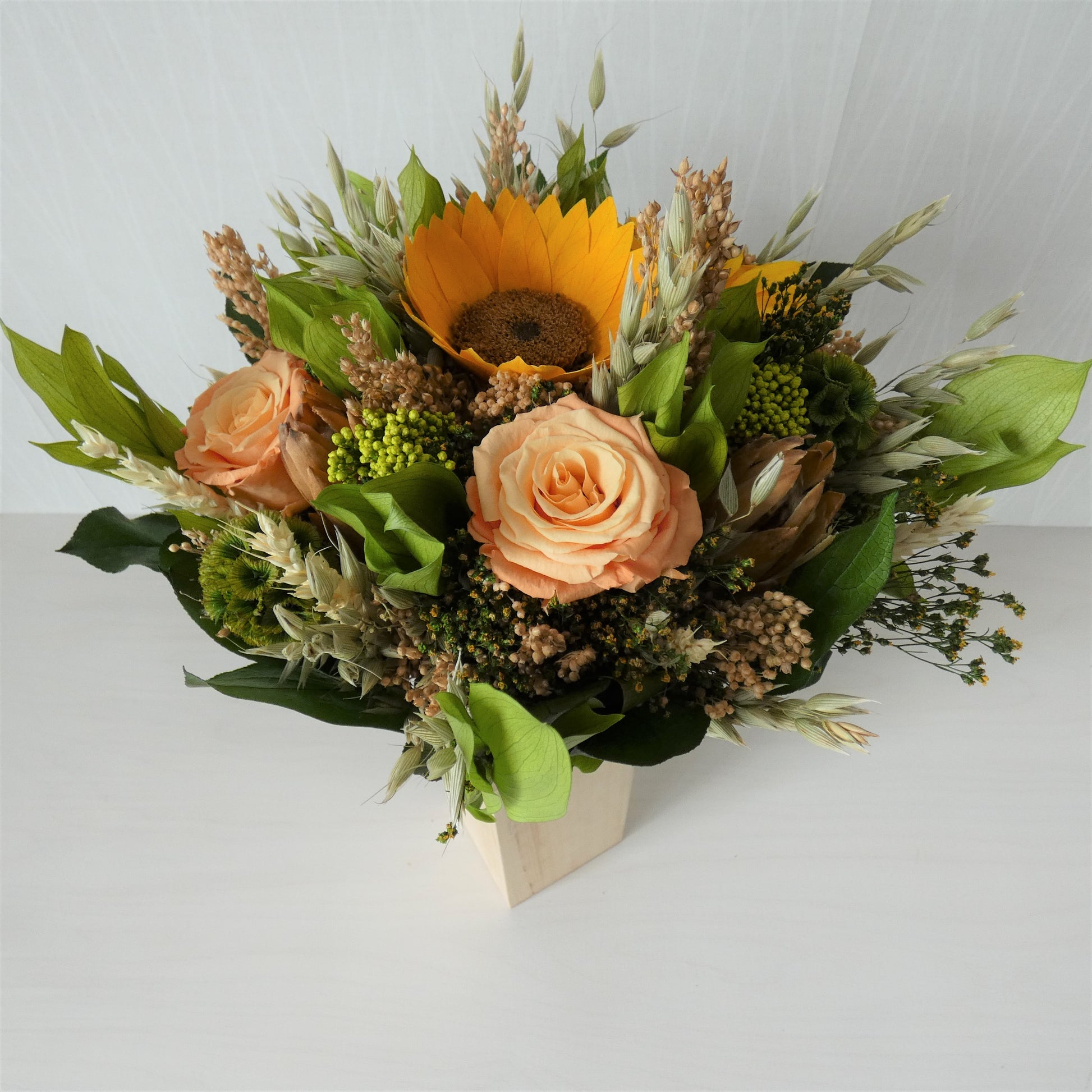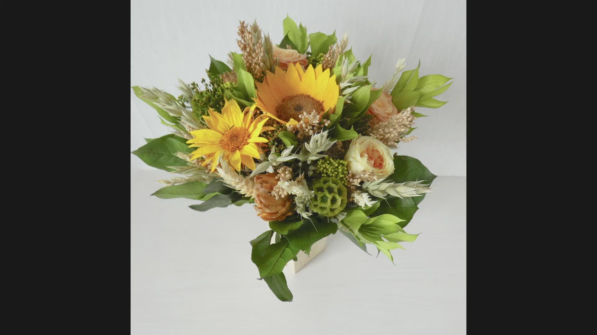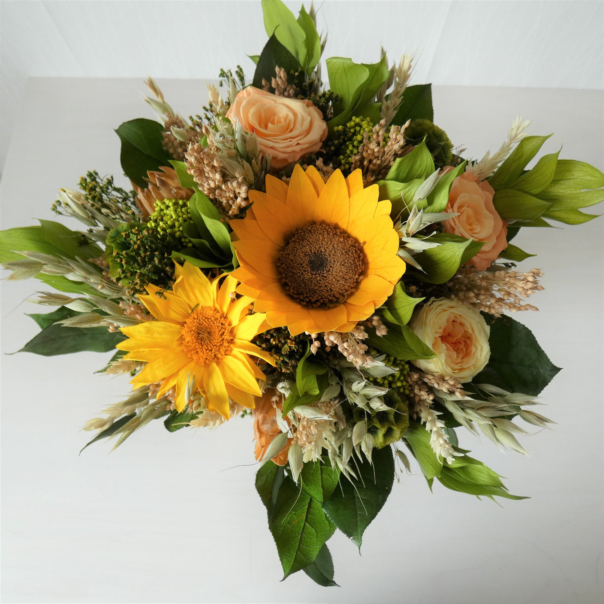 The delightful design includes two mesmerizing sunflowers accompanied by two peach L size roses and one peach orange English rose, light green rice flowers, light green scabiosa stellata, dried proteas,dried panicum grass, dried oats and wheats, preserved and dried broom blooms, preserved green ruscus and salal.